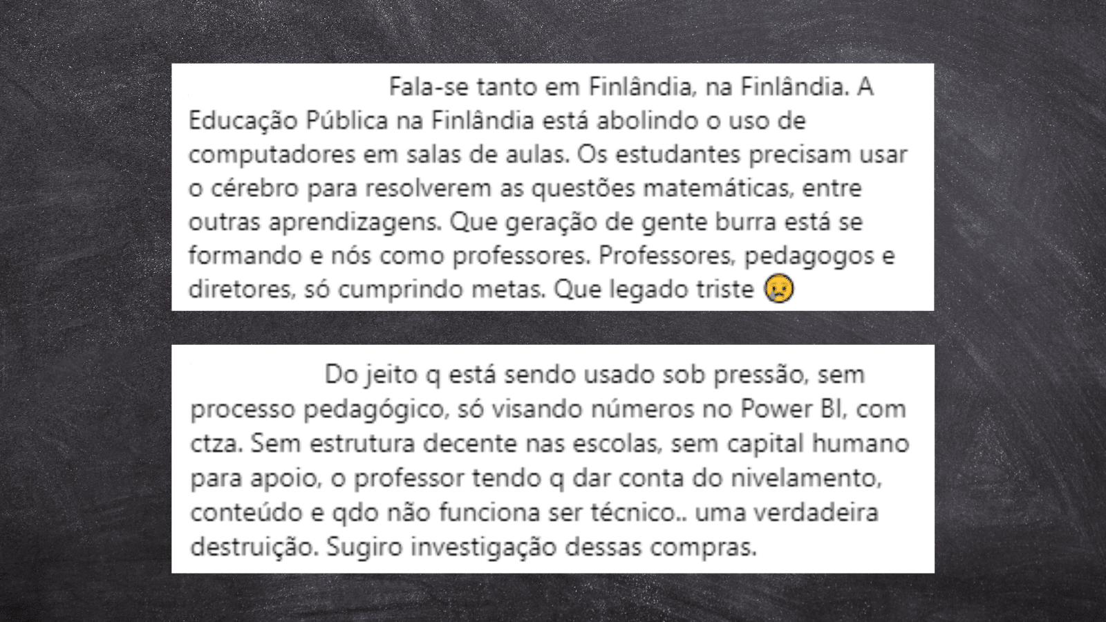 O documento é mais um que põe em xeque o modelo educacional adotado pelo governo do Paraná e destaca que a tecnologia sozinha não garante bons resultados. No Peru, por exemplo, mais de um milhão de laptops foram distribuídos sem qualquer impacto na aprendizagem.